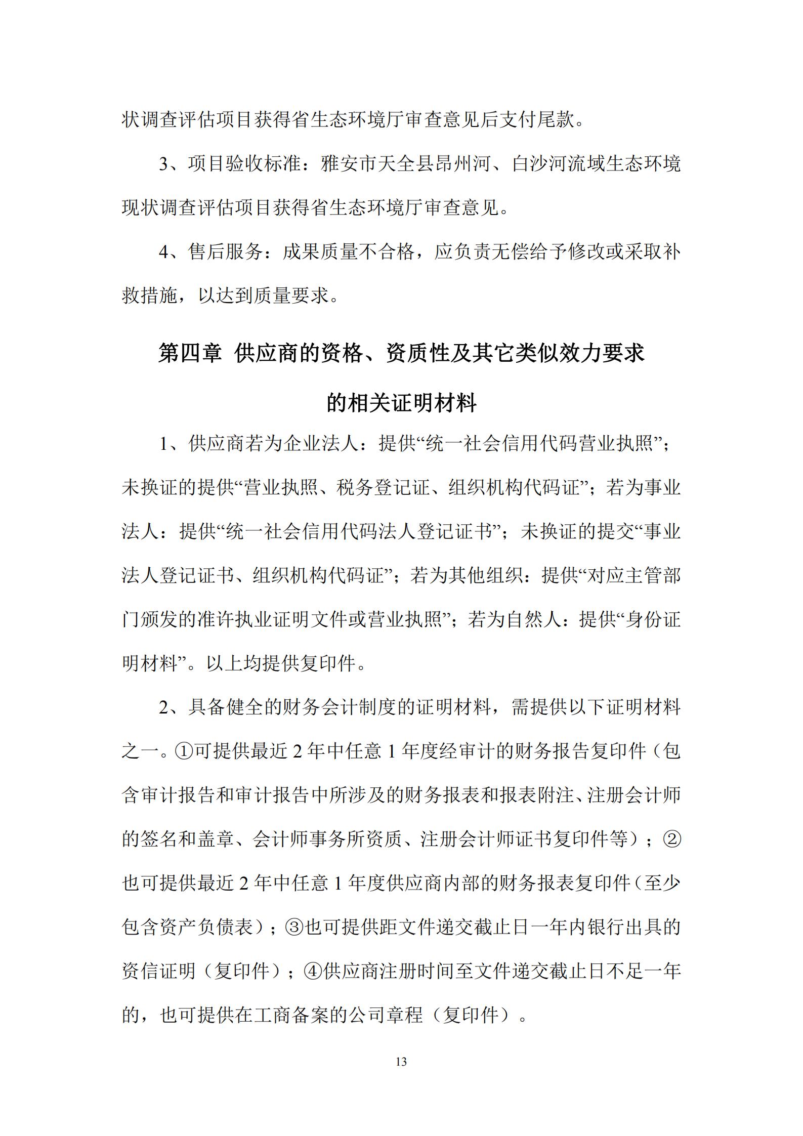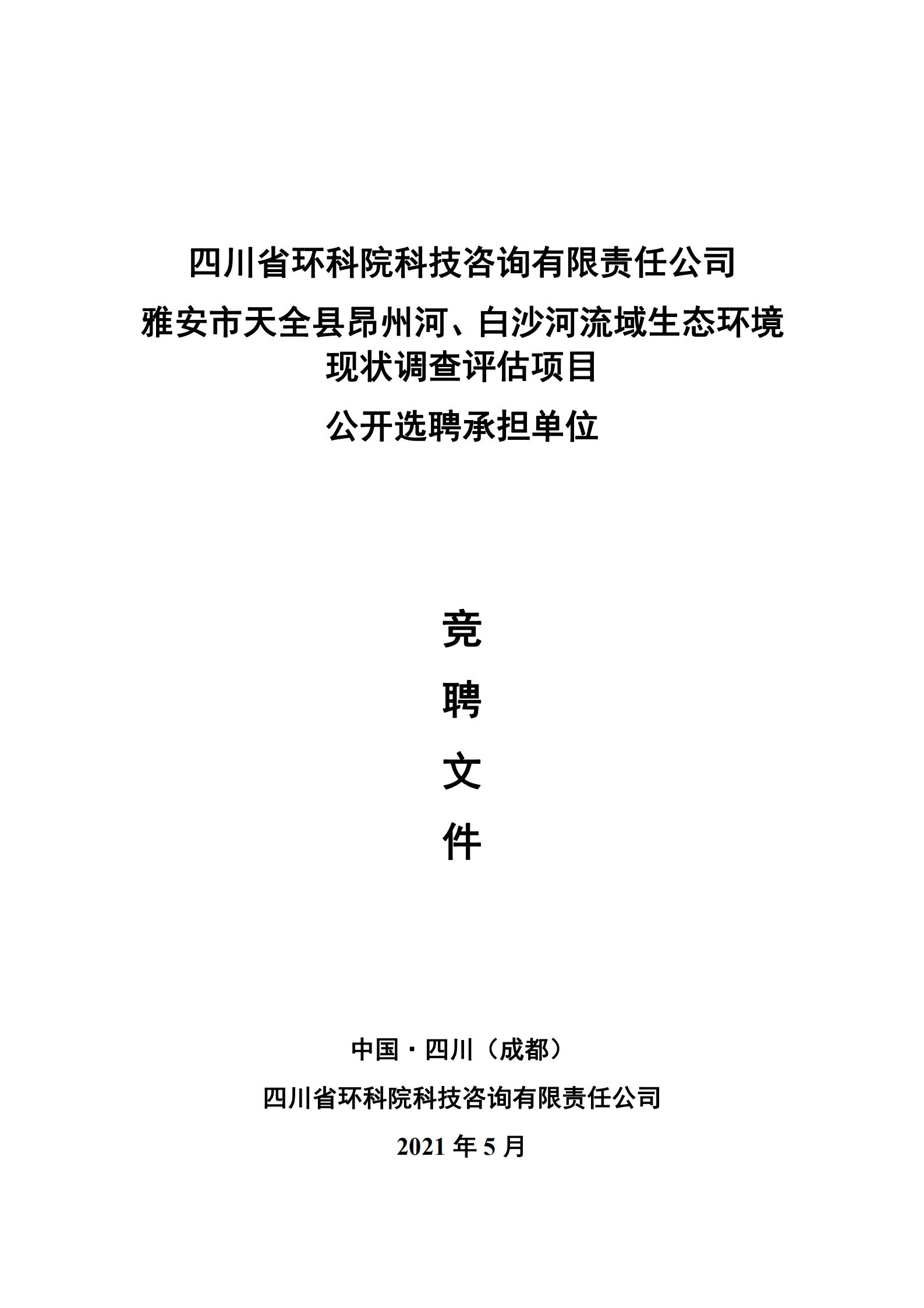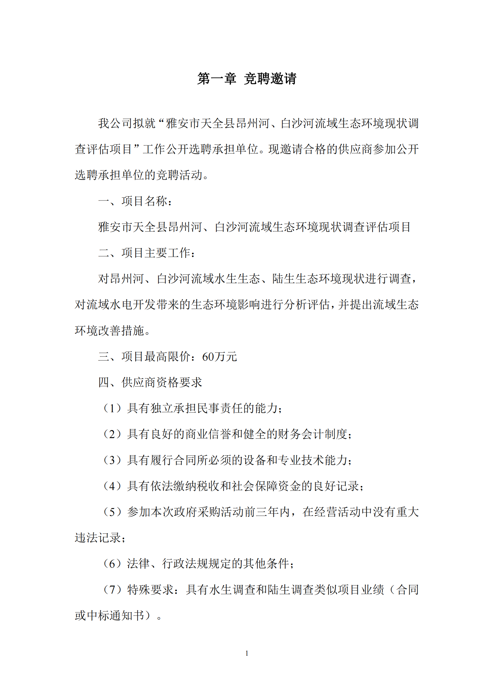 我公司擬就“雅安市天全縣昂州河、白沙河流域生態(tài)環(huán)境現(xiàn)狀調查評估項目”工作公開選聘承擔單位?,F(xiàn)邀請合格的供應商參加公開選聘承擔單位的競聘活動,選聘文件如下: